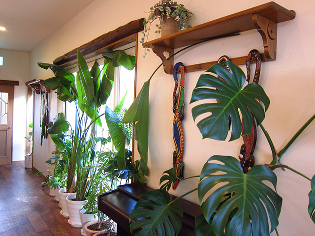 このお部屋には、モンステラやストレリチアなどの観葉植物がたくさん置いてあります。
