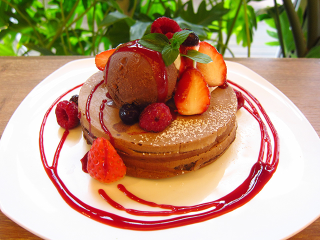 甘さ控えめのココア生地のパンケーキのうえに、チョコアイスと苺やラズベリー、ブルーベリーの甘酸っぱいベリーがごろごろのります。