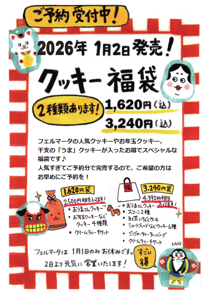 フェルマータで1月2日からご提供するクッキー福袋のご予約を、そろそろ締め切ります。